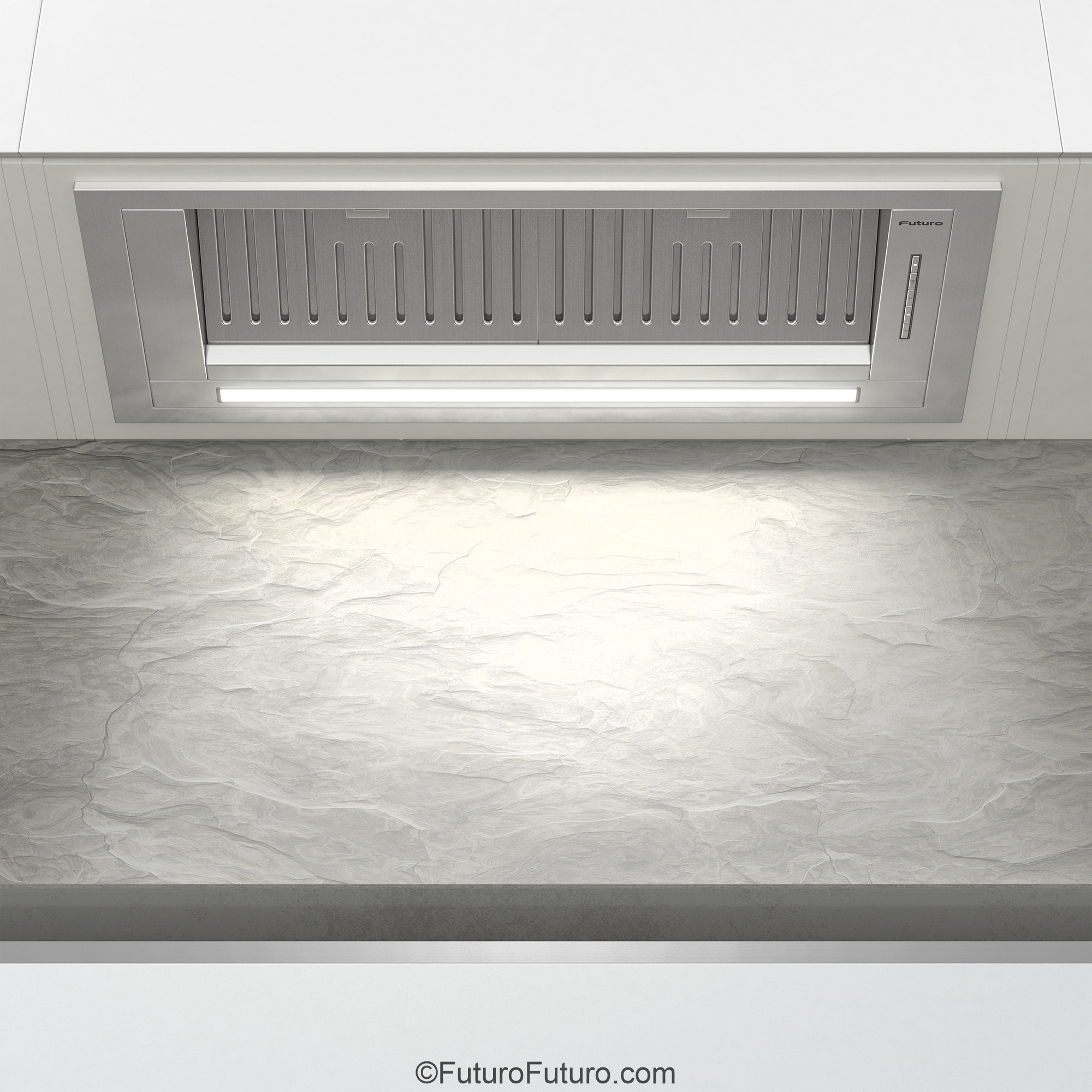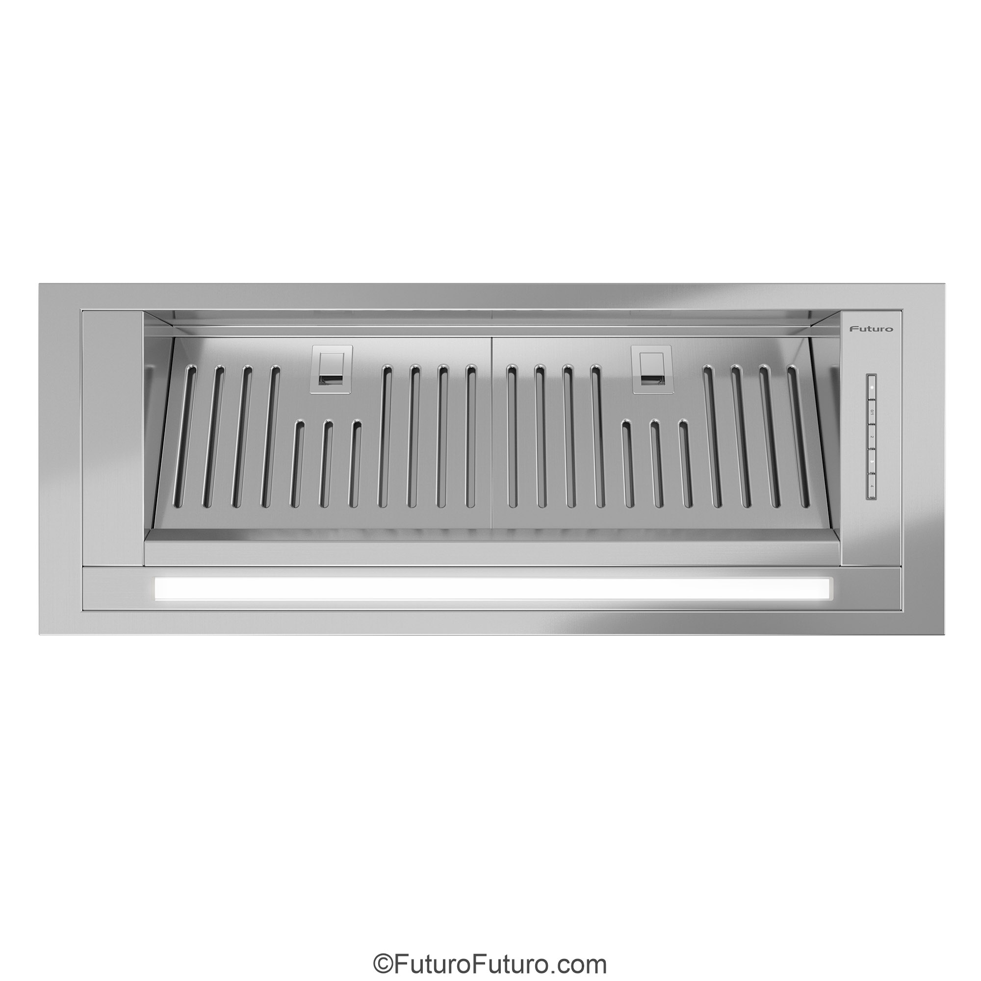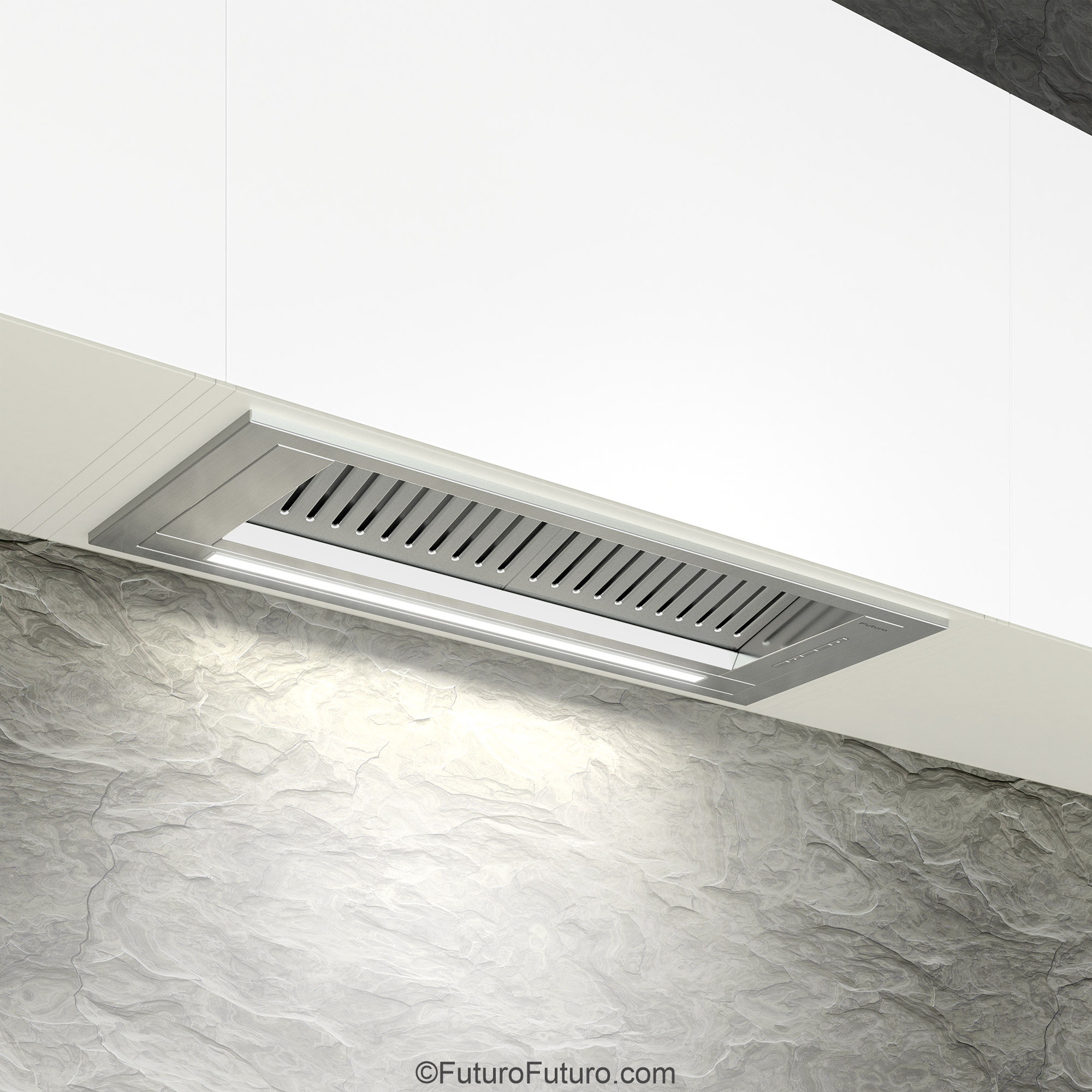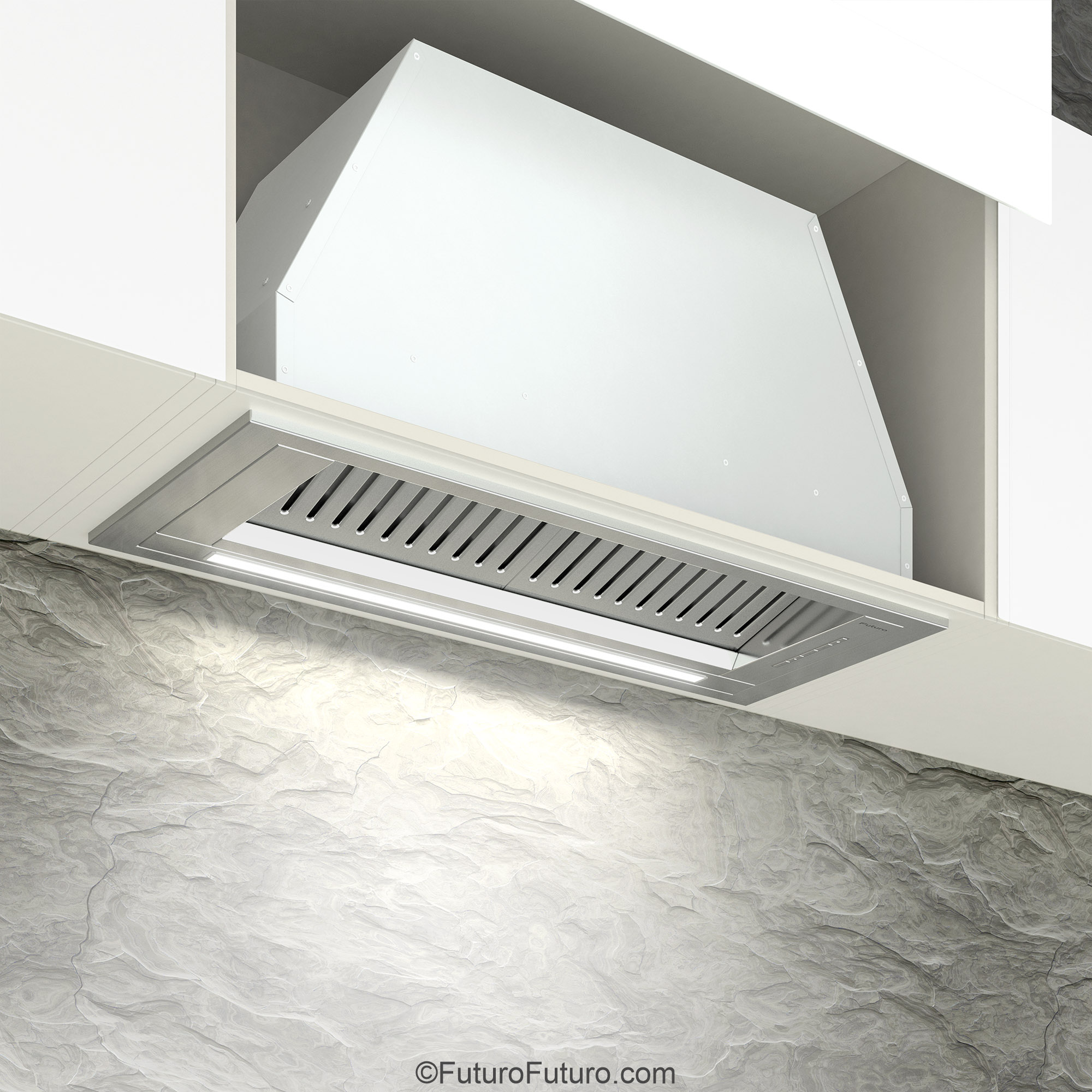 Introducing the Futuro Futuro 30″ Designo Baffle Insert Under-Cabinet Range Hood — a seamless blend of minimalist Italian design and professional-grade ventilation.