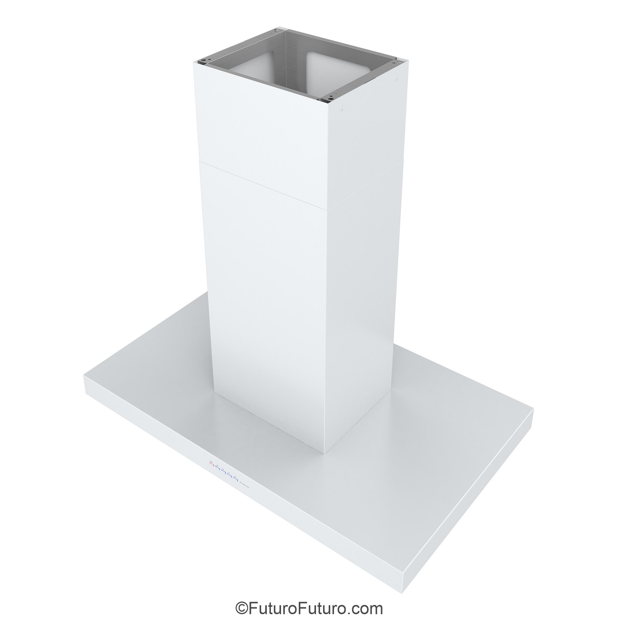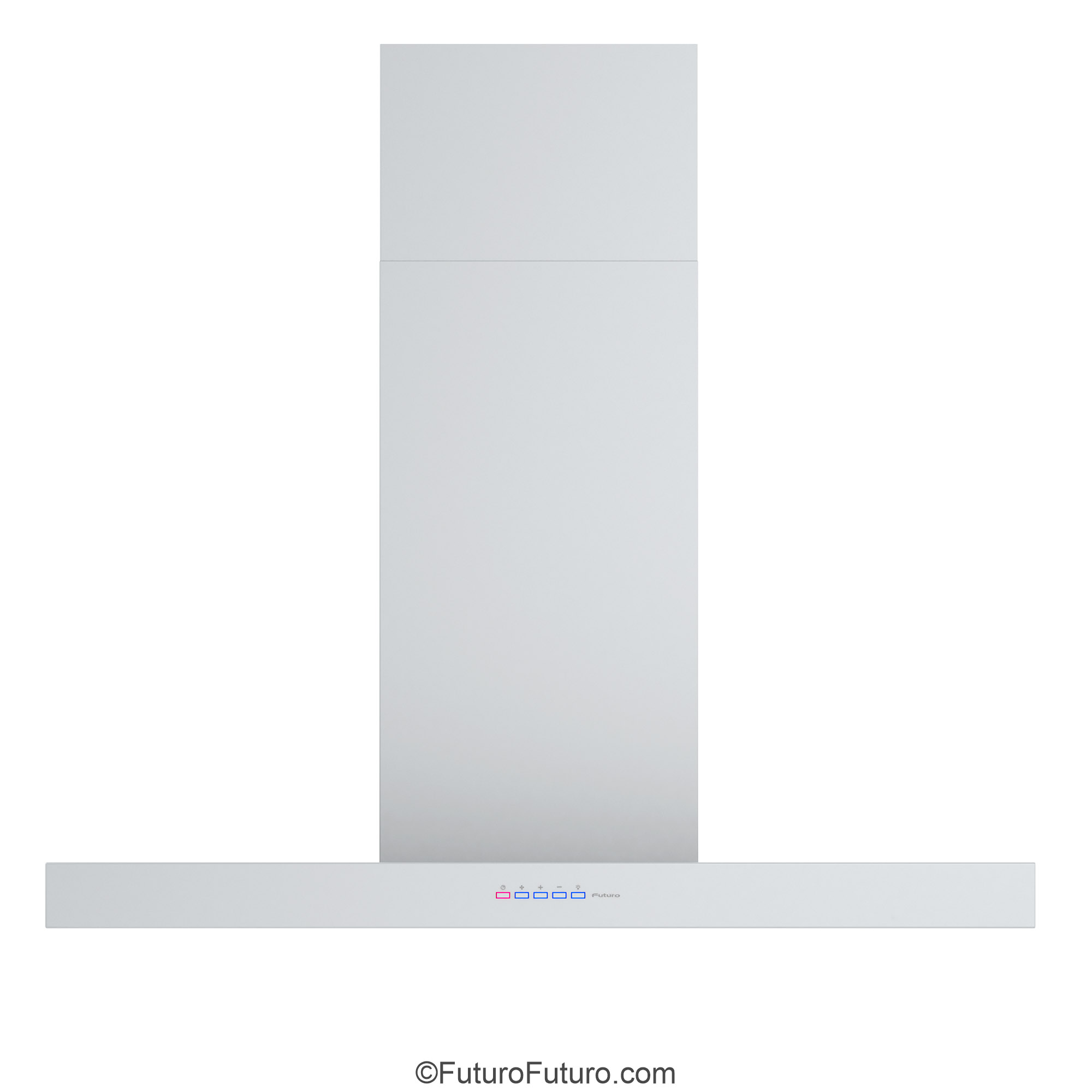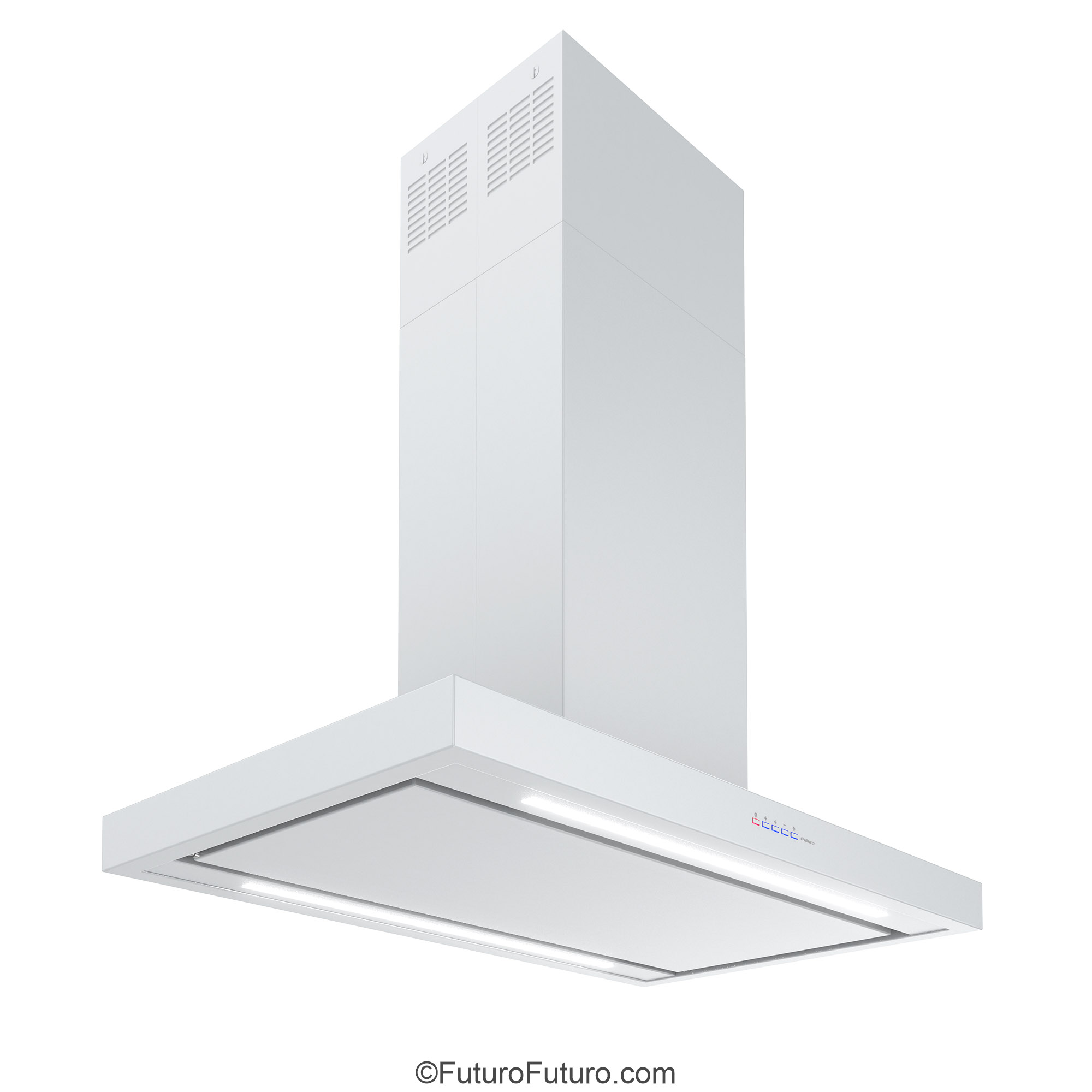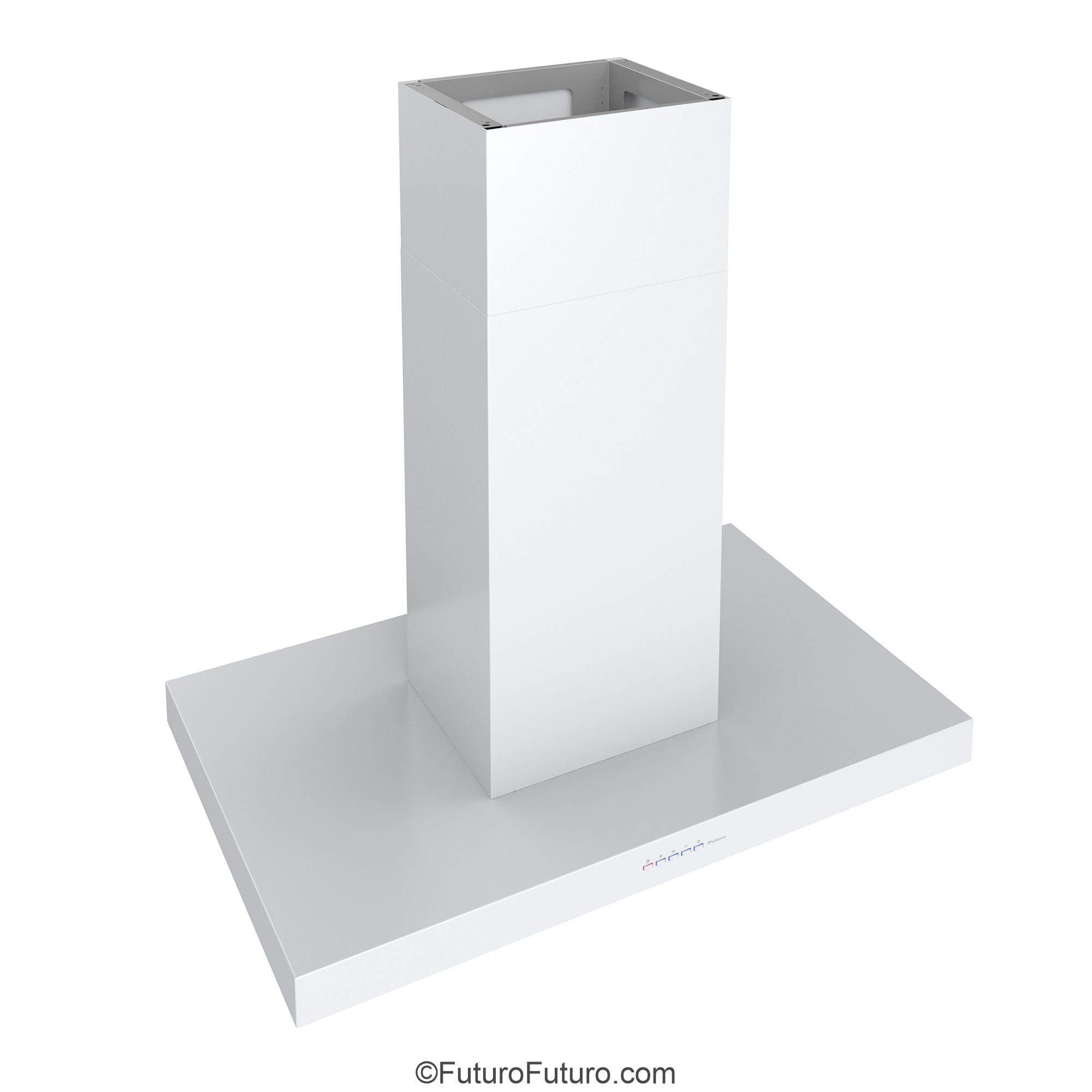 Futuro Futuro’s 36-Inch Minimal White Island Range Hood brings a simple rectangular design that will fit into any kitchen. This simple design calls the attention of any guest to the heart of your kitchen, the cooking. With a beautiful semi-gloss white enamel applied over the Stainless Steel body makes a bold visual statement your guests are sure to remember. This hood is designed to fit perfectly in any kitchen with stark contrasting colors. The design of the Minimal range of hoods is perfect for any minimalist valuing quality over quantity. To make this hood, fine Italian craftsmen start by sculpting the body of the hood with the highest grade AISI 304 Stainless Steel. Then they apply a semi-gloss white enamel finish that is durable to help prevent any scratches or blemishes. This all makes for a low maintenance hood that can always immediately be restored to a like-new condition with just the swipe of a rag. In keeping with minimalist values of quality over quantity, a 940 CFM Internal Whisper tangential blower brings you all the power you could need in a kitchen hood without any of the noise. This low noise profile hood is made possible through Futuro Futuro’s cutting edge developments in sound absorbing chambers. It brings the noise of this hood down to barely audible levels so you can restore the sanctity of your kitchen. The filtration in this hood comes from easy to remove, dishwasher safe metal mesh grease filters that provide a time tested filtration system. This offers a low-maintenance yet highly effective solution to kitchen ventilation. When these filters are due for a cleaning, the minimalist control panel sends you a convenient reminder ensuring your hood is always running at peak efficiency. From this same control panel you can switch between any of the four adjustable speeds and set a delayed shut-off timer. Effortlessly customize your space with the dynamic LED light strip, offering intuitive control over both color temperature (from cool to warm white) and brightness to perfect your ambiance.. The 36-Inch Minimal White Island Range Hood has minimalist values at the heart of its design with a low-profile appearance, high quality craftsmanship and materials, and cutting edge technology. sku: IS36MINIMALWHT