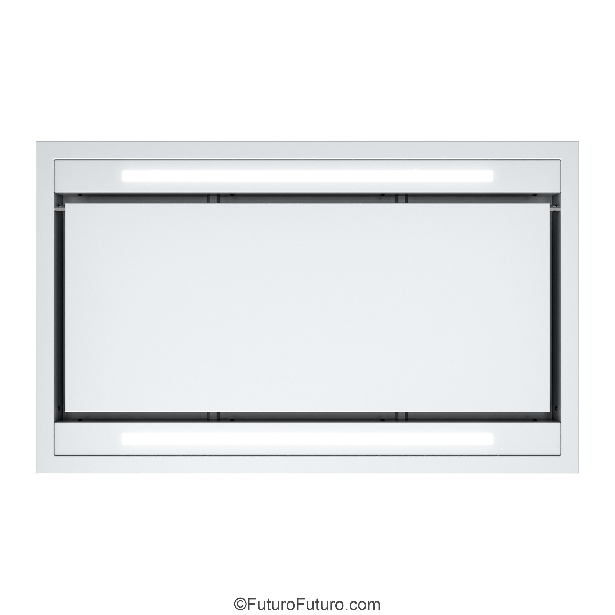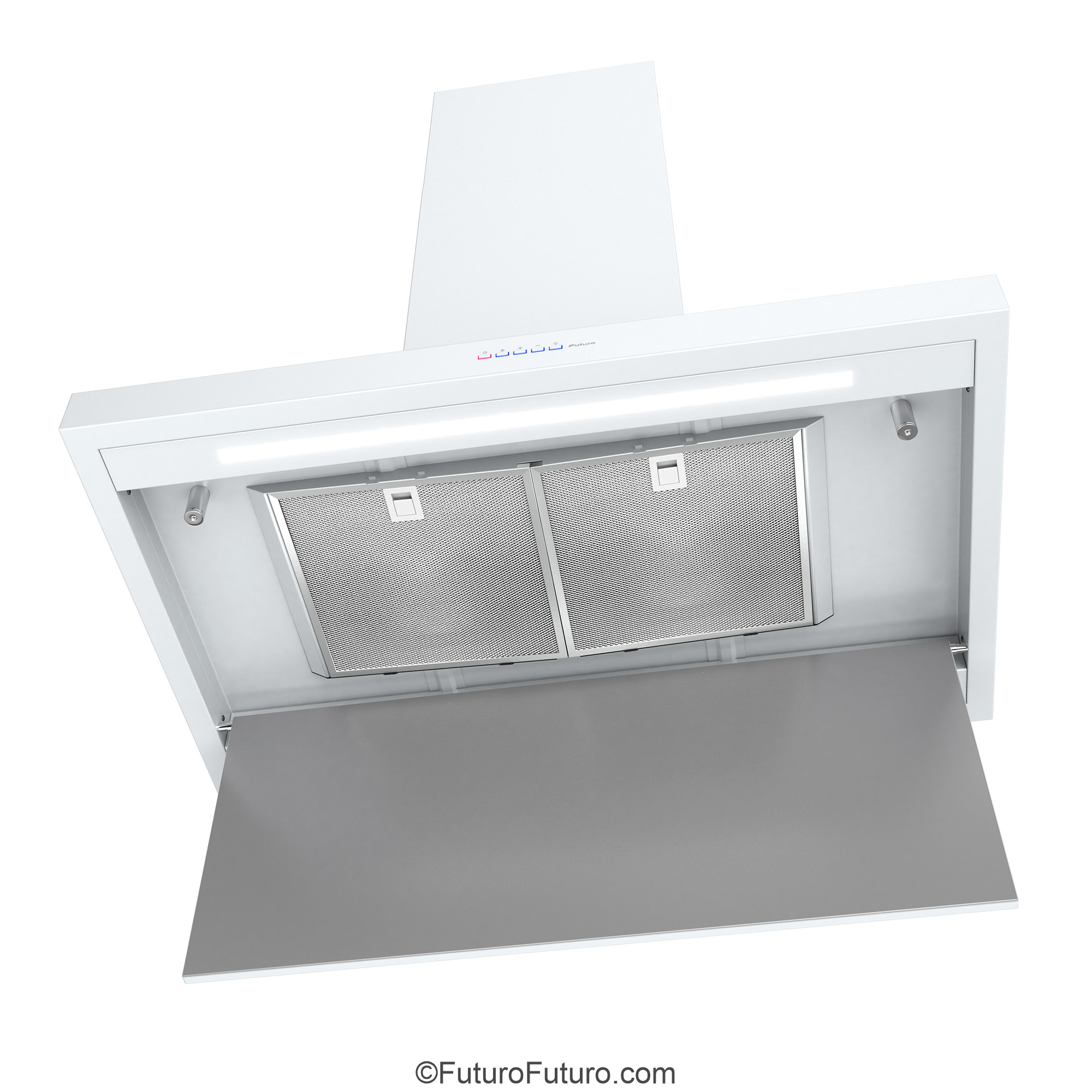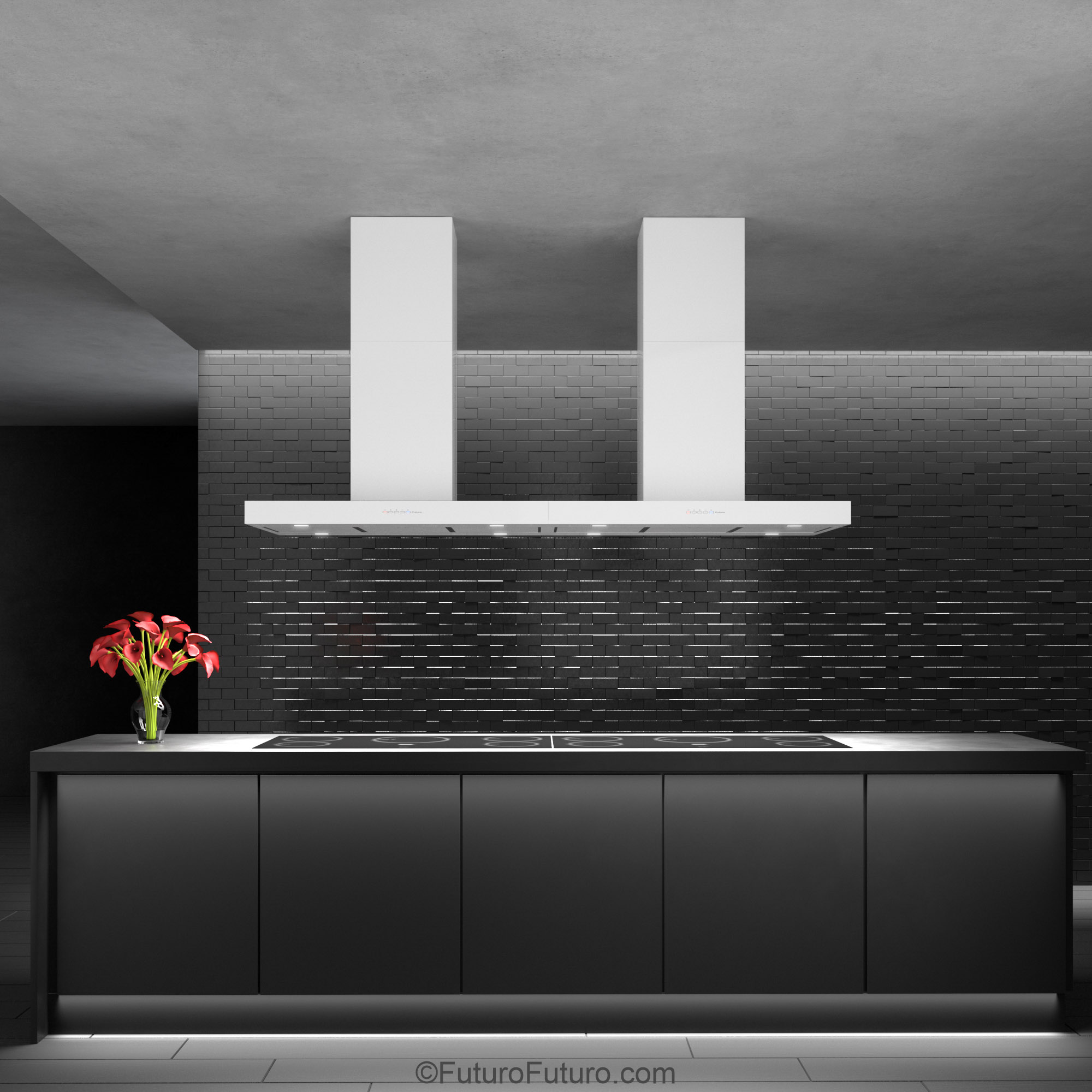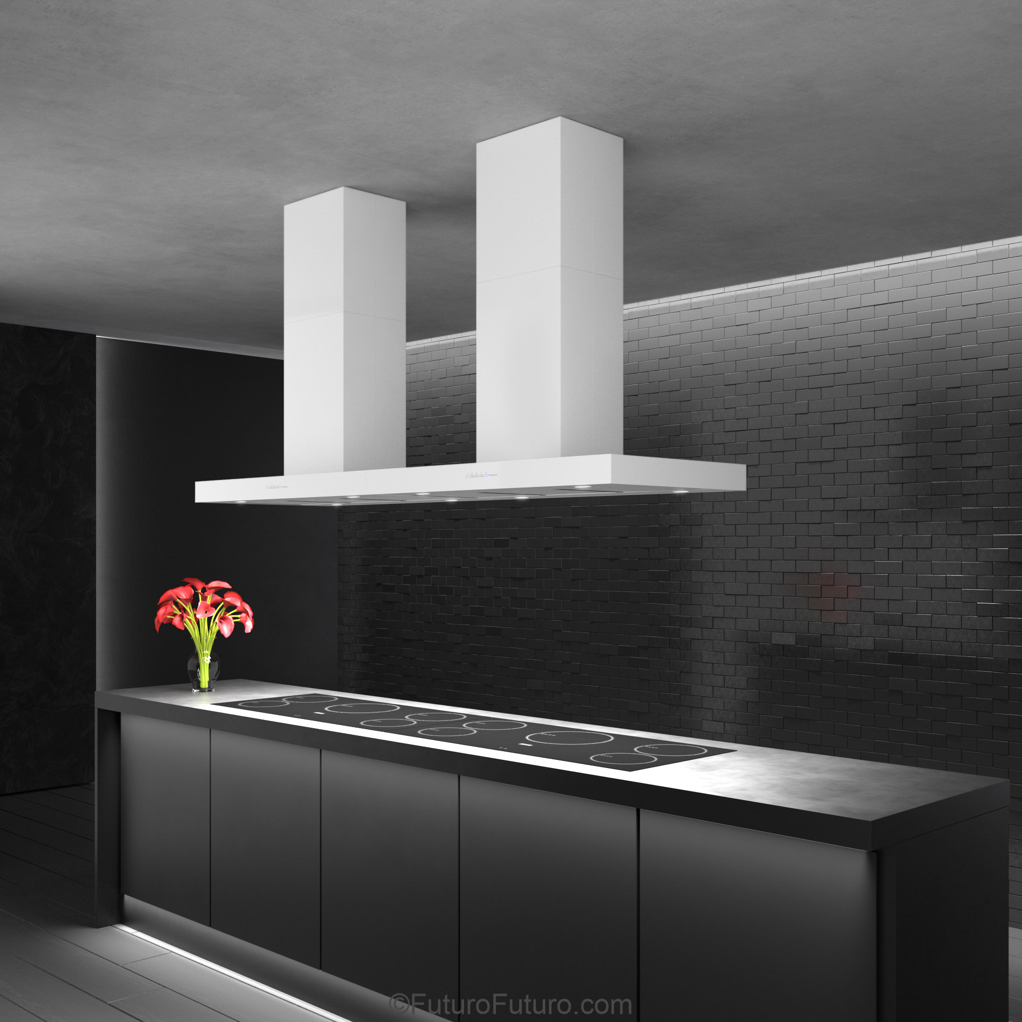 Futuro Futuro’s 36-Inch Minimal White Island Range Hood brings a simple rectangular design that will fit into any kitchen. This simple design calls the attention of any guest to the heart of your kitchen, the cooking. With a beautiful semi-gloss white enamel applied over the Stainless Steel body makes a bold visual statement your guests are sure to remember. This hood is designed to fit perfectly in any kitchen with stark contrasting colors. The design of the Minimal range of hoods is perfect for any minimalist valuing quality over quantity. To make this hood, fine Italian craftsmen start by sculpting the body of the hood with the highest grade AISI 304 Stainless Steel. Then they apply a semi-gloss white enamel finish that is durable to help prevent any scratches or blemishes. This all makes for a low maintenance hood that can always immediately be restored to a like-new condition with just the swipe of a rag. In keeping with minimalist values of quality over quantity, a 940 CFM Internal Whisper tangential blower brings you all the power you could need in a kitchen hood without any of the noise. This low noise profile hood is made possible through Futuro Futuro’s cutting edge developments in sound absorbing chambers. It brings the noise of this hood down to barely audible levels so you can restore the sanctity of your kitchen. The filtration in this hood comes from easy to remove, dishwasher safe metal mesh grease filters that provide a time tested filtration system. This offers a low-maintenance yet highly effective solution to kitchen ventilation. When these filters are due for a cleaning, the minimalist control panel sends you a convenient reminder ensuring your hood is always running at peak efficiency. From this same control panel you can switch between any of the four adjustable speeds and set a delayed shut-off timer. Effortlessly customize your space with the dynamic LED light strip, offering intuitive control over both color temperature (from cool to warm white) and brightness to perfect your ambiance.. The 36-Inch Minimal White Island Range Hood has minimalist values at the heart of its design with a low-profile appearance, high quality craftsmanship and materials, and cutting edge technology. sku: IS36MINIMALWHT