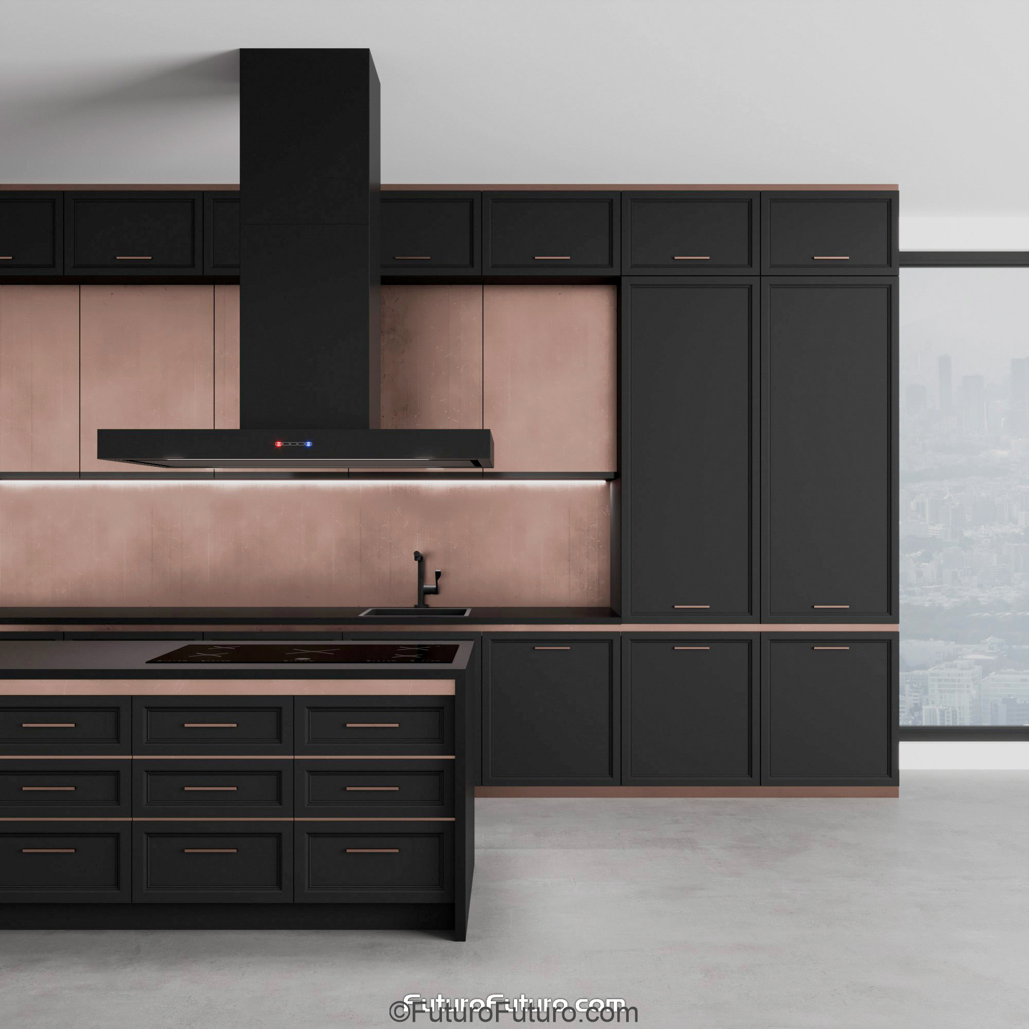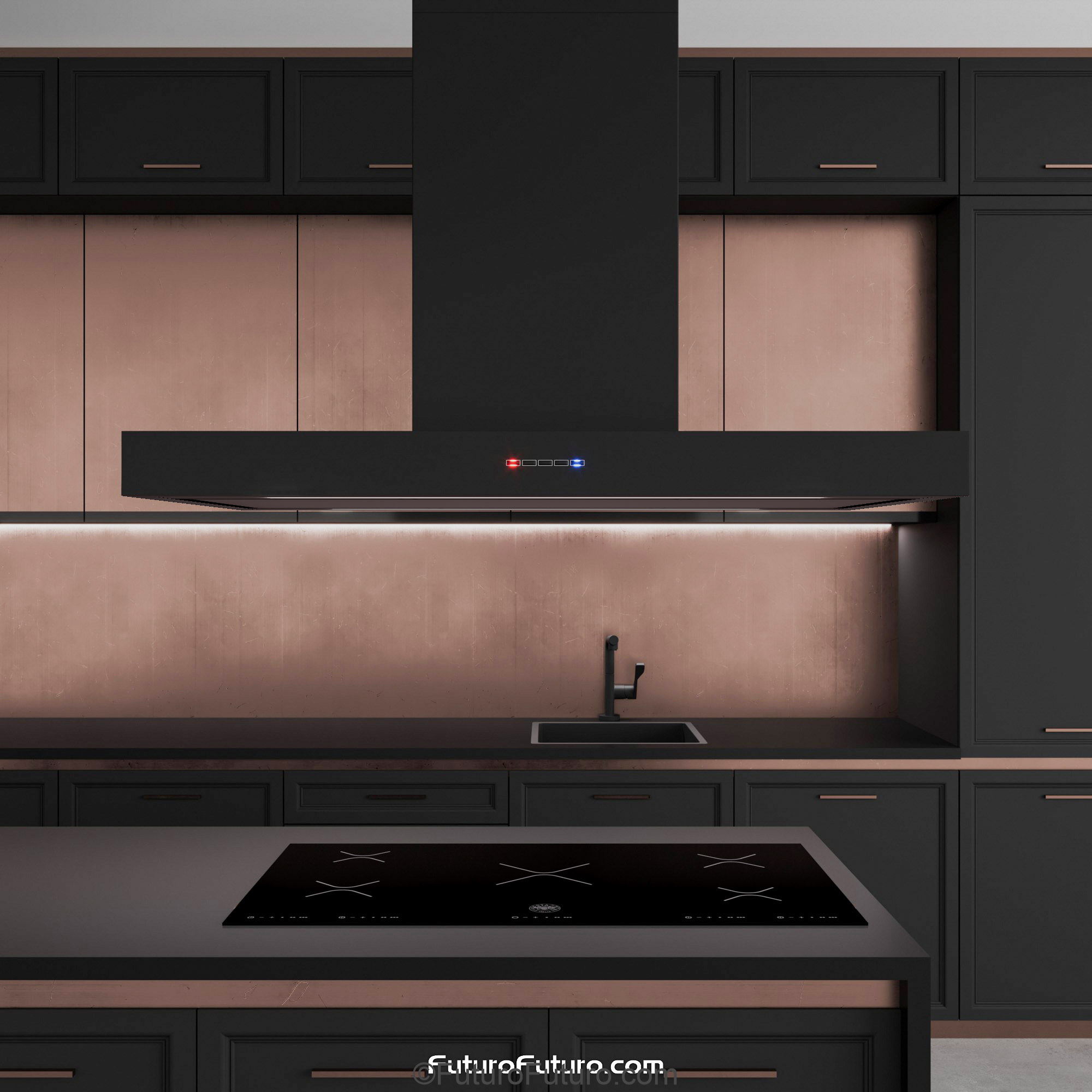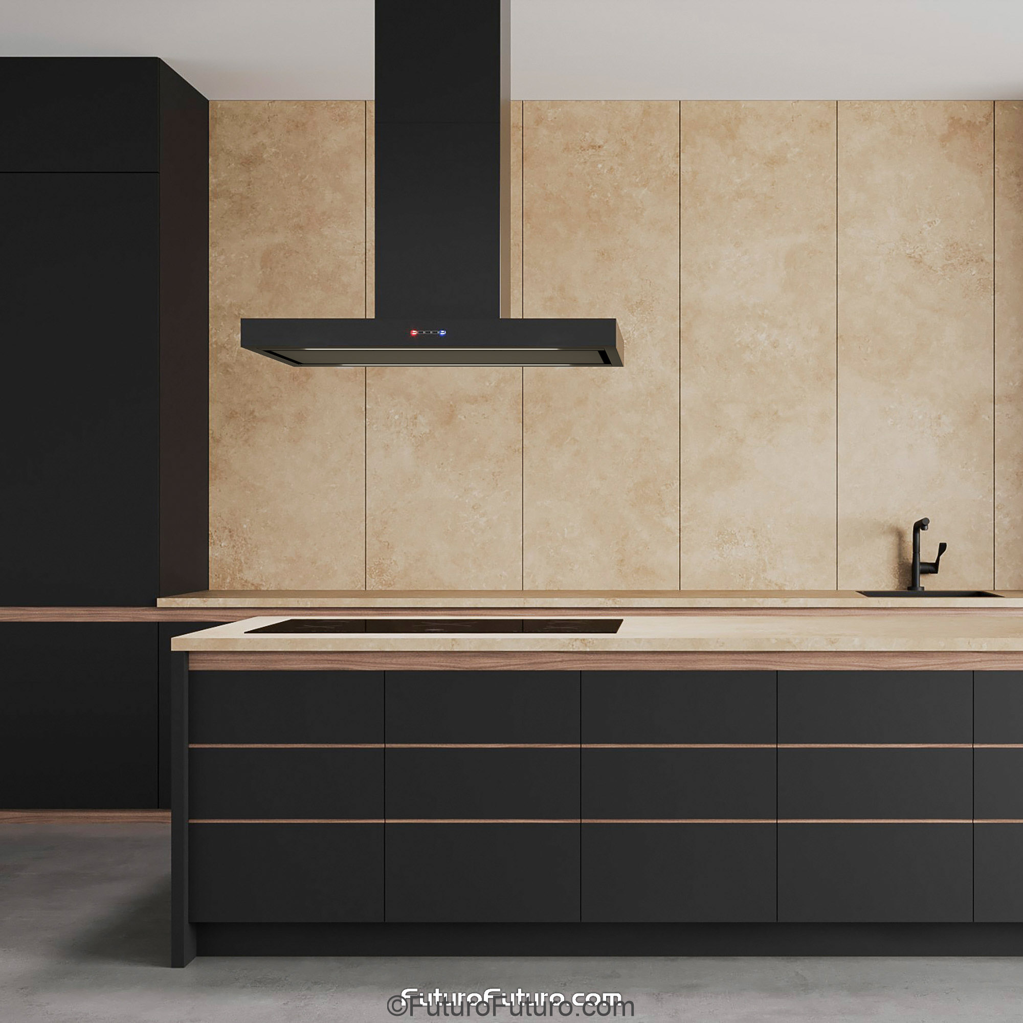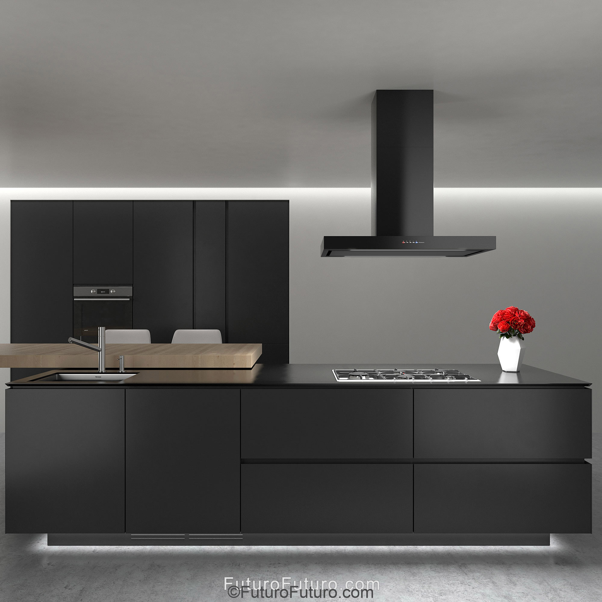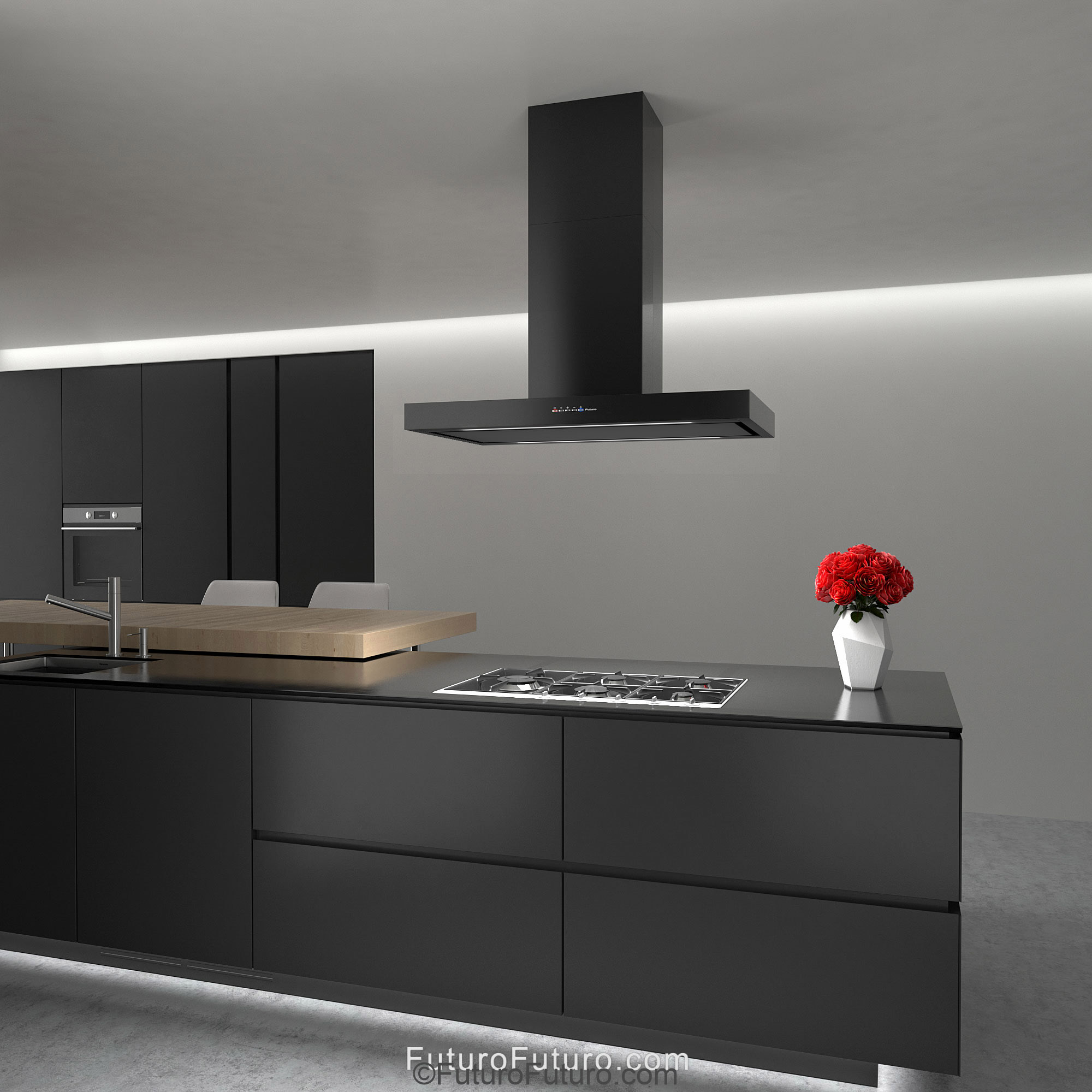 Slender and ultra-contemporary, the Futuro Futuro 36 inch Positano black island range hood is both an attractive kitchen accessory and a powerful appliance. This contemporary range hood is designed to mount to the ceiling and is built from high grade steel. Designed for durability, this modern range hood employs a unique electrolysis infusion technique to coat the exterior in a black enamel paint, resulting in a damage-resistant and stylish finish. Robust and efficient, this luxury range hood features an efficient air filtration system that works diligently to keep your kitchen clear of unwanted odors, smoke, and steam during cooking. Futuro Futuro’s advanced air filtration system redirects airflow from the center of the exhaust hood to edges, permitting increased suction of particles and contaminants with significantly reduced ambient noise. This suspended range hood also contains dishwasher safe metal grease filters that easily entrap airborne oil and grease. This designer range hood offers many user-friendly features, including its four different airflow suction speeds, a built-in, electronic, control panel, and energy efficient LED lights. The dynamic LED strip lets you dial in the exact white light temperature and brightness you need, ensuring your light is always as meticulous as your taste. Regular use and maintenance is simple and easy with this black range hood’s automated reminders that regulate and indicate when it’s time to clean the grease filters in the dishwasher to maintain this ceiling mount range hood’s optimal performance. This Italian range hood also possesses the convenient delayed shut-off function, which keeps the ventilation hood running after you have finished cooking until all odors, grease, smoke, and steam have been removed from the air. This feature allows the user to turn their focus to other tasks while the ventilation hood does the work. Customers may purchase this kitchen range hood as a ducted exhaust vent, as well as for ductless application with a help of additional set of carbon filters. All Futuro Futuro exhaust hoods come with a one year US standard plus two additional years parts warranty, and our technical experts are happy to assist with questions that may arise during installation or regular use. Proving to be as handsome as it is efficient, the 36 inch Positano black island mount range hood is a popular choice for modern kitchen owners. SKU: IS36POSITANO-BLK